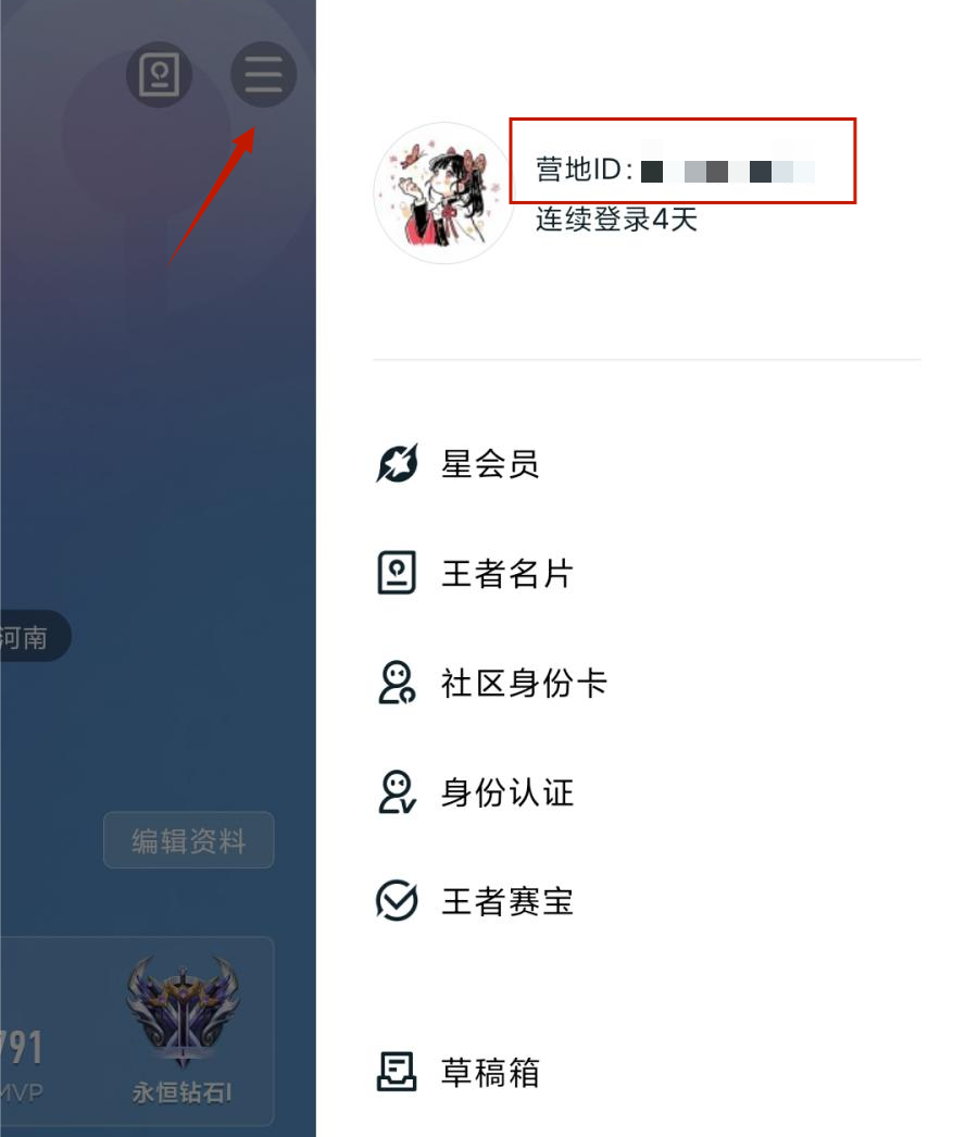 点击主页右上角【三横杠】,即可查询到对应账号的营地ID。