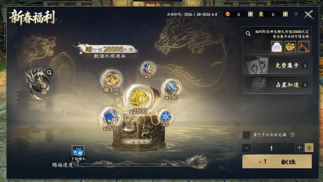神龙赐瑞活动仅剩最后一周,福利不等人,少侠们可以在游戏界面右上角更便捷地进入活动界面。 在界面献上如意龙珠后,会随机增加1-10点进度,进度持续攀升,丰厚奖励层层解锁——包括永久奇珍马【向禄临马】、永久妙品时装【紫绡蝶梦】、联动时装【瑞春迎福】在内的奖励都能带走,少侠们可千万别错过哦!