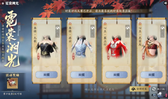 10月9日-10月26日,点击【五载秋水记今朝】庆典活动页面【霓裳溯光】为你最爱的外观投票2次,当天即可获得时装自选礼盒*1,不用等待,50+畅销外观随心选!如果没有想要选择的时装也可以选择2000月灵石哦~还有问影晶石、随心染匣等好礼等你来拿!