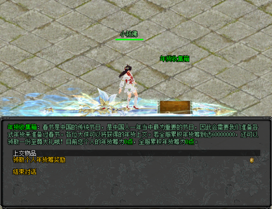活动期间,大侠通关指定副本、完成日常任务可获得爆竹、春联、团圆食材等年货材料,上交至成都 “年货收集箱” 累积个人与全服年货筹。每天贡献满 500 点,可领每日礼盒;累积达标解锁阶梯奖励;当全服筹满 60000000 点且 个人贡献≥5000 点,可领含坐骑 “新年年兽”(游戏运营期内长期有效) 的至尊礼盒。每天 21:00 还有 100 份限量好礼先到先得。