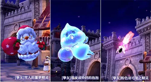 NPC帕尼亚商店中新增3款【挚友】精灵和3款【挚友】坐骑。「雪人的噩梦精灵」憨态可掬,送上节日的温馨祝福,「想变成铃铛的泡泡」灵动俏皮,为紧张战斗增添轻松氛围;「粉色羽毛笔之精灵」俏皮可爱,随时为你记下冒险趣事。
