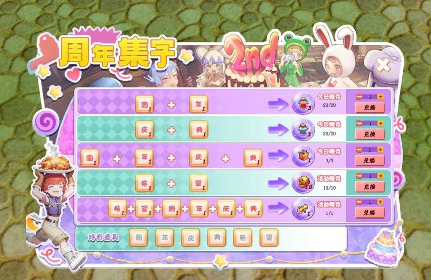 集齐特定字符,可兑换红蓝药水、外卖礼盒等实用道具。而最值得期待的,是集齐“希”“望”“周”“年”“庆”“典”六字,即可兑换永久限定称号【happy two 希望】,拥有非常优秀的属性!这是属于二周年勇士的独特荣耀,千万别错过。