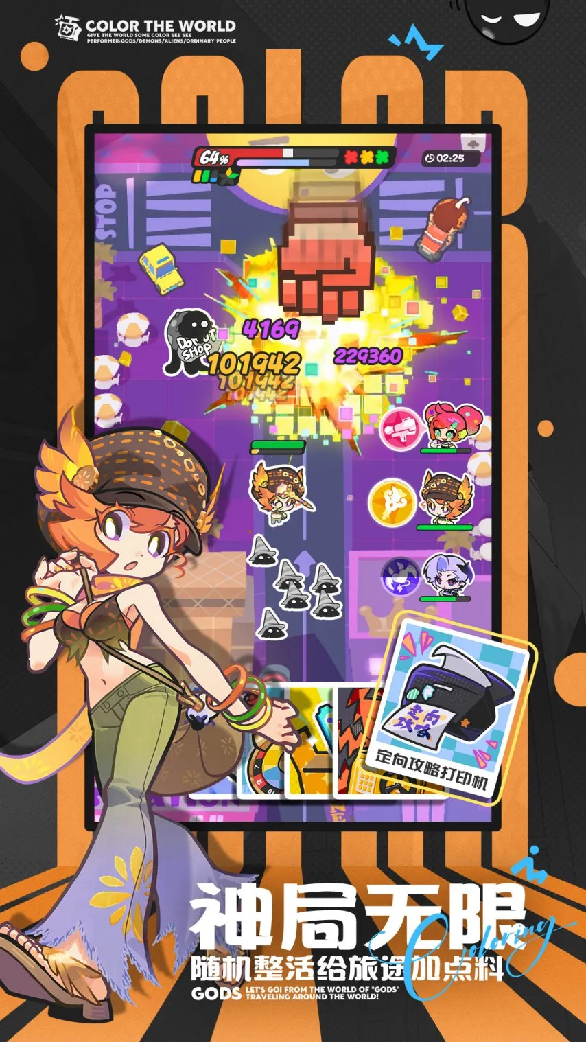 放肆染色,指涂一乐。如果你想在碎片时间收获轻松有趣、搞怪无厘头的体验,就来一起和神明娘放肆染色,顺便拯救世界吧!
