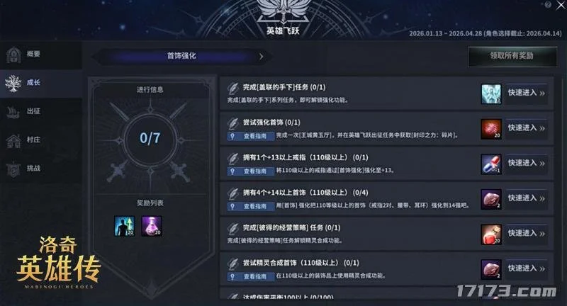 当角色达到115级后,就可以参与至全新系统“英雄飞跃”之中。“英雄飞跃”是为115级以上角色量身打造的帮助装备成型的便利与福利兼具的系统,由于奖励丰厚,因此为限时开启的活动模式。在活动期间每个大区仅可选择1个115级以上角色参与,参与英雄飞跃的角色需完成4个不同进度任务(成长、出征、村庄、挑战),完成后可获得丰富多样的奖励哦!