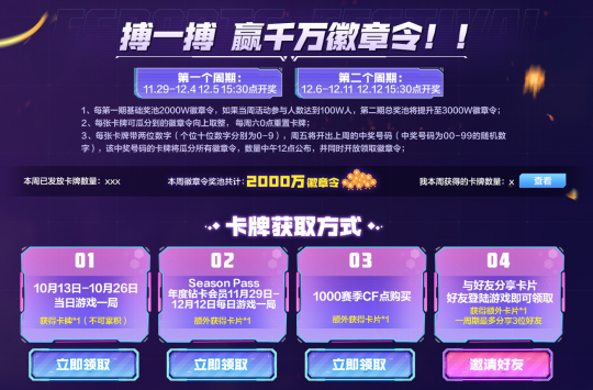 参与方法:CFer每日游戏1局得1张卡牌和一定数量的徽章令,并且SeasonPass会员每日游戏可额外获得1张卡牌。