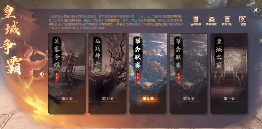 同时,各大帮会需要注意:关塞争雄和帮会联赛的胜负名次,将为帮会积累对应的帮会积分。最终本服帮会积分名列前茅者,可参与终极【皇城之巅】争夺战。