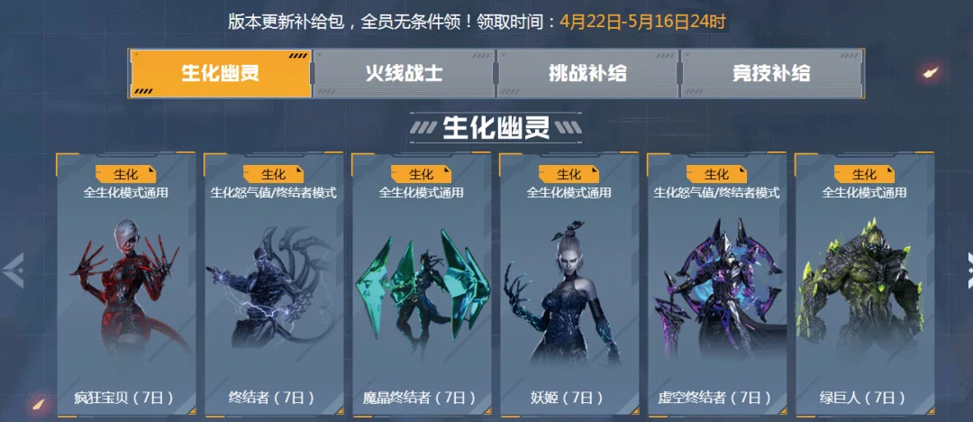 4月22日-5月16日24时,CFer还可在活动界面无条件领取生化幽灵、火线战士、挑战补给以及竞技补给四重版本更新补给包,助力CFer体验全新版本。