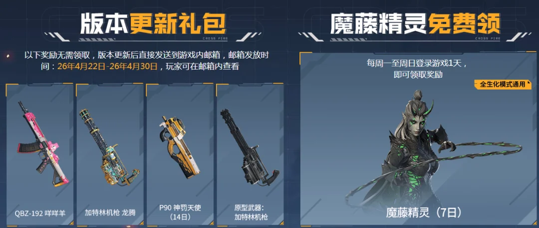 另外版本更新后还将在邮箱中直接发放QBZ-192 咩咩羊、加特林机枪 龙腾、P90 神罚天使(14日)以及原型武器:加特林机枪作为版本更新礼包,各位CFer记得领取!同时每周任意登录1天还可领取魔藤精灵(7日),赶紧试试吧!